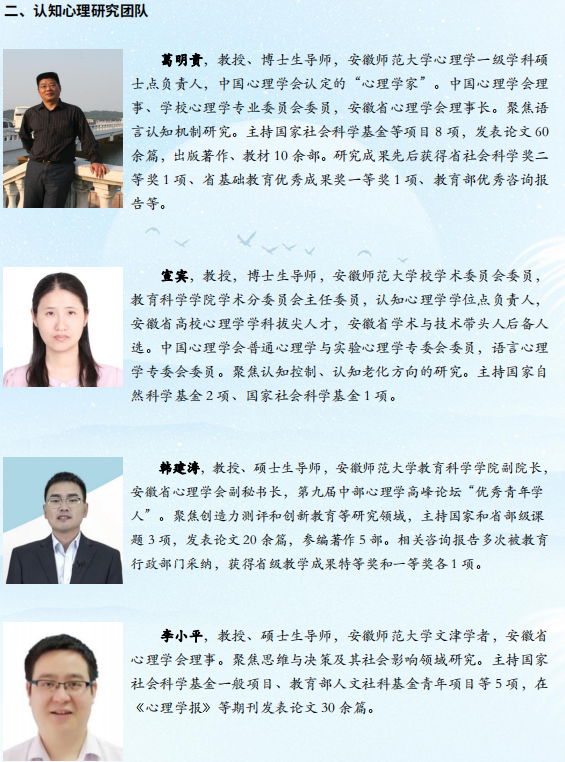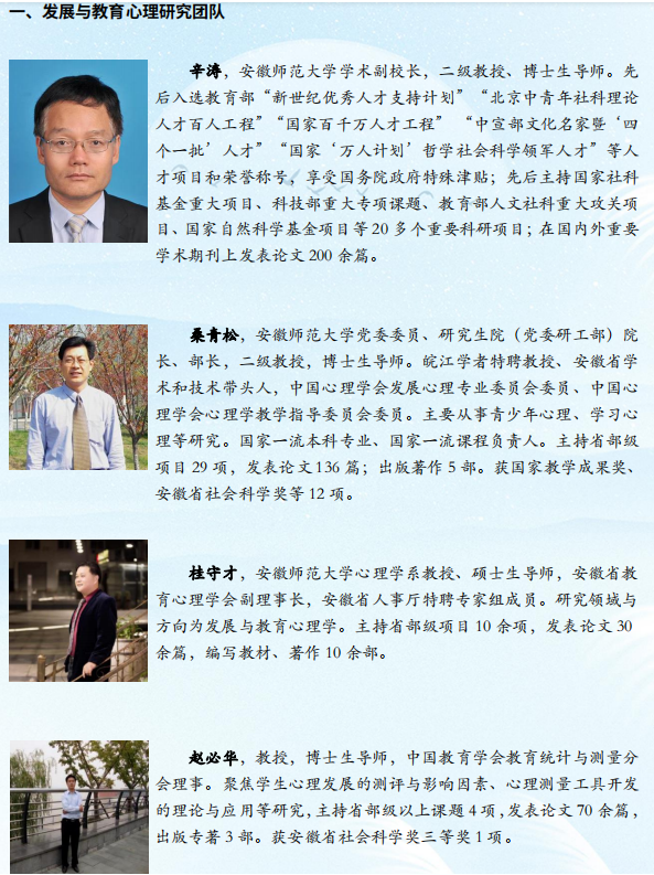 本专业现有专任教师32人,实验员1人,其中教授6人,副教授14人;博士生导师5人,硕士生导师19人;有博士学位(含2人在读)教师19人。教师队伍中,中国心理学会认定的“心理学家”2 人,安徽省皖江学者特聘教授1人,安徽省学术和技术带头人1人,安徽省学术和技术带头人后备人选2人,安徽省高校学科拔尖人才1人,安徽省中青年学科带头人2人,安徽省优秀教师1人。