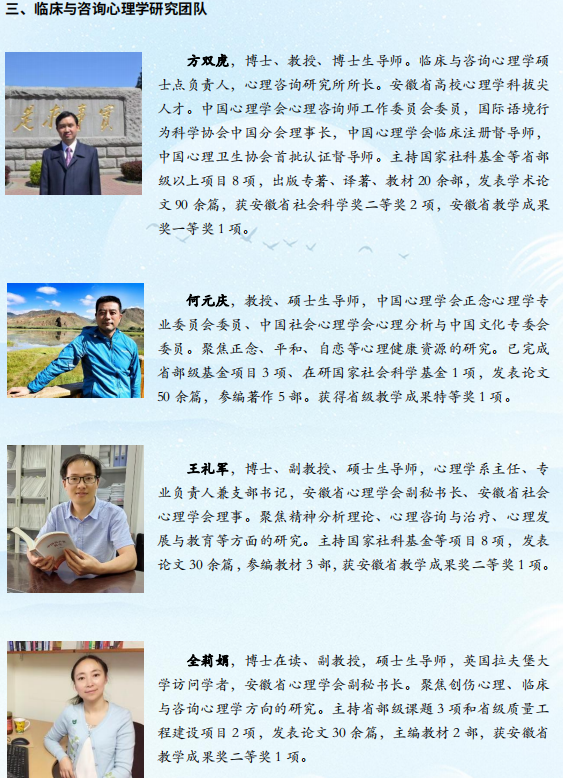 培养目标:立足安徽基础教育需求,面向长三角及周边区域,培养具有深厚的家国情怀、良好的师德品性、扎实的学科基础、突出的教学能力、出色的综合管理和育人能力、出众的自我成长潜能、德智体美劳全面发展的高素质心理健康教育专业化人才。毕业生能够独立承担心理健康教育教学和科研,能够独立开展心理咨询和各类心理辅导活动,具有良好的沟通、管理和协作能力。为中小学校、心理健康服务机构等企事业单位输送专业基础厚实、实践能力过硬、综合素养突出的专业型心理健康教育师资。