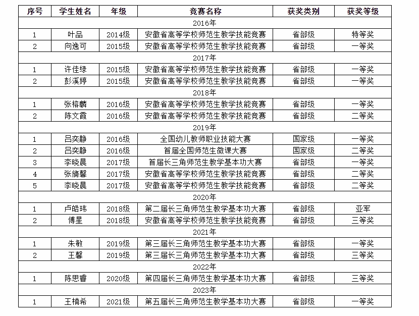 《2016中国大学评价研究报告》显示学前教育专业为3星级“中国区域一流专业”,全国排名并列第18位,省内排名第一。2018年增设学前教育二级学科博士点,该专业是目前安徽省高等院校中唯一具有学前教育学博士研究生培养资格的学校。目前已形成本科-硕士-博士、全日制与非全日制、国内与国际合作的多层次、多类型的办学结构。