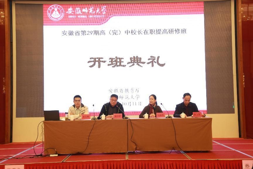10月11日上午9时整,安徽省第29期高(完)中校长在职提高培训班开班典礼在酒店三楼举行。安徽师范大学继续教育学院副院长贾会明、365英国上市官网副院长何海燕、365英国上市官网副院长吴文涛、继续教育学院培训部主任朱升学、本期研修班班主任汪四清老师和来自全省16个地市的98名校长参加了开班仪式。仪式由何海燕主持。贾会明首先致开幕词。