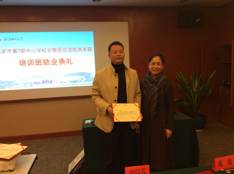时间在紧张而又有序的学习、研讨和参观活动中过去了,2016年11月7日下午,重庆市第7期中小学校长教师交流轮岗专题研讨培训班举行了结业典礼。结业典礼上四位学员代表,分别做了培训心得的交流与分享。他们认为这次学习是紧张而有序的,安徽师大教科院的安排,无论是培训的内容还是生活上,都非常细致和周到且贴心,学员们不仅学到了许多理论知识,开阔了视野,而且通过实地参观考察,增长了自己的见识,学员之间也结下了深厚的友谊,这种友谊搭建了以后相互交流的平台。最后,何海燕副院长为每位学员颁发了结业证书。至此,重庆市第7期中小学校长教师交流轮岗专题研讨培训在学员们依依不舍和其乐融融的氛围中,圆满结束。