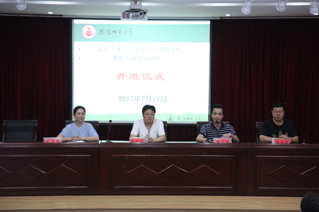 本网讯  教科院  姚运标 北京工业大学附属中学双桥分校教师专业发展研班,2017年7月1721日在安徽师范大学赭山校区顺利举行。本次研修班北京市朝阳区教育局继续教育办公室主办,安徽师范大学继续教育学院和365英国上市官网承办。7月17日上午,在安师大赭山校区图书馆报告厅举办了开典礼,参加典礼的有:北京市朝阳区教育局继续教育办公室主任景为国,北京工业大学附属中学双桥分校校长洪涛,安徽师范大学继续教育学院副院长贾会明,365英国上市官网副院长何海燕;安徽师范大学继续教育学院市场开发部主任陆贤涛以及北工大附属中学双桥分校参加研修23位老师本班班主任姚运副教授。开班典礼何海燕副院长主持。贾明副院长首先代表学校欢迎各位学员来到安徽师范大学,然后向参加研修北京学员们介绍了安师范大学在安徽教育尤其是基础教育发展中的作用和地位同时对参加研修的学员提了希望为国主任随后发言,他介绍了本次研修班的举办目的,并对本次研修班学员提出了几点要求。最后何海燕副院长代表教科院向北京的老师们表示欢迎之后,向大家介绍了365英国上市官网专业设置情况,师资的现状,以及本次研修班的课程和学习安排等。