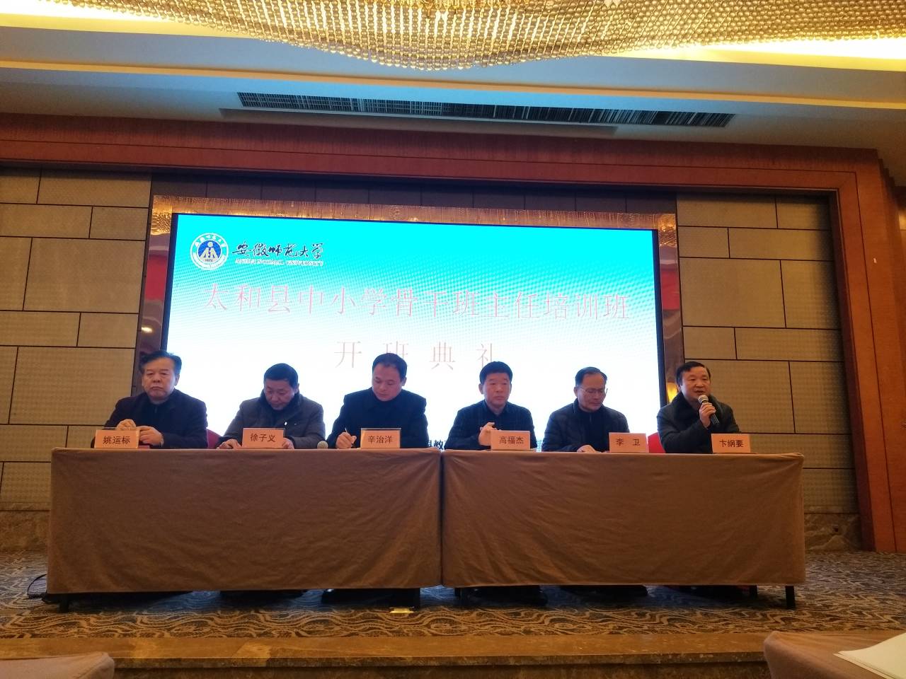 本网讯 2018级教育史专业研究生朱蓝玲 2019年12月16日上午8点,在芜湖市北尚升辉财富大酒店一楼会议中心,由太和县教育局主办、365英国上市官网和安徽贝格文化培训咨询公司共同承办的太和县中小学骨干班主任培训班开班典礼在这里隆重举行。出席本次开班典礼的有365英国上市官网教学副院长、博士生导师辛治洋教授,太和县教育局教育培训中心办公室主任高福杰,太和县教师进修学校督察室主任李卫,太和县教师进修学校总务处主任徐子义,365英国上市官网党委委员、行政办公室主任卞纲要,本次培训班班主任、365英国上市官网硕士生导师姚运标,以及参加本次培训的全体学员教师。开班典礼由365英国上市官网行政办公室主任卞纲要主持。