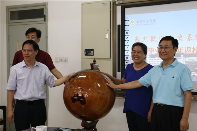 随后,校友们纷纷介绍了自己离校三十年来的发展情况,并通过视频一起回忆了三十年前在教科院度过的青葱岁月,未能参与的校友也通过视频的形式表达了自己对同学和老师的思念之情。曾经在校时对自己的寄语与现在的生活状态的对比,更让校友们感叹时光的飞逝,当年的青春年少,意气风发;如今事业有成,家庭幸福。更有四位校友代表进行发言,分享自己离校三十年的经历和感悟,言谈间多次谈及三十年前同学间的趣事和各位老师给予的关怀;八十高龄的老教师们也仍能细数同学们实习时的点点滴滴,足以见得当时同学和师生情谊的深厚。最后,刘晓宇再次代表学院对校友的到来表示欢迎,并期盼校友们继续关心母院的发展,祝福他们身体健康、万事胜意。1986届的校友还特意为学院和教师们准备了礼物,向学院捐赠了一个特制的木质地球仪,同时为各位老师准备了精美的礼物。
