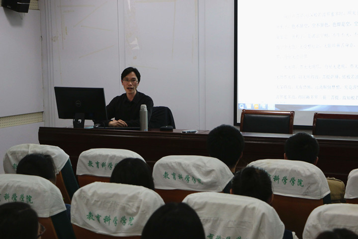 本网讯(教科院 14级教育学蒋昕)4月12日下午,安师大教育学专业2001届毕业生、杭州师范大学严从根博士莅临我院,做了一场主题为“经典阅读和美好生活---从施特劳斯学派说起”的学术报告。报告会由专业负责人辛治洋教授主持,教育学全体学生聆听了本次讲座。