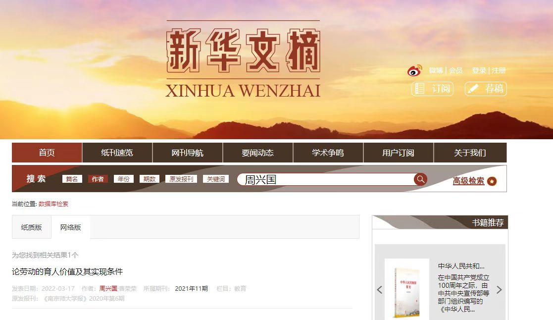 近日,学院阮成武教授与博士生唐菡悄合作发表的论文《改革开放以来高等教育与就业的关系演进与逻辑嬗变》、周兴国教授与博士生曹荣荣合作发表的论文《论劳动的育人价值及其实现条件》,分别被《新华文摘》网刊于2021年第10期和11期全文转载。