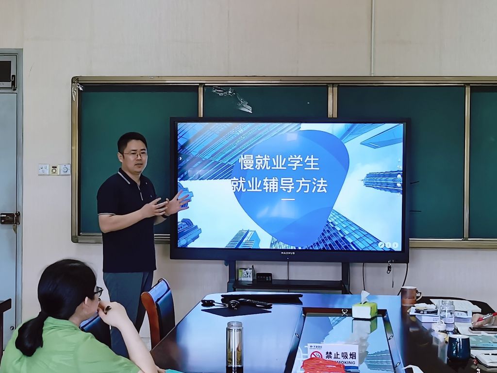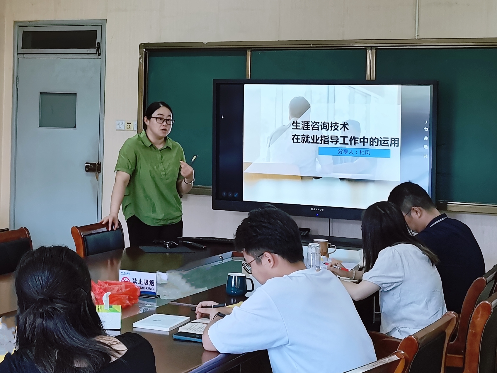 会上,杜凤与辅导员莫大贡分别从“生涯咨询技术在就业指导工作中的运用”以及“慢就业学生就业辅导方法”两个方面展开学习交流。他们主要围绕辅导员在就业指导服务理念、方式角色,重点难点,以及慢就业的原因分析、慢就业学生类型划分,以及如何应对等话题进行了探讨。
