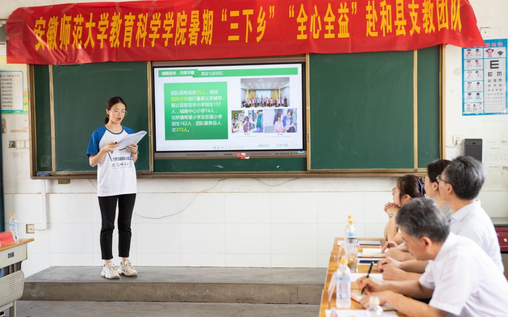“和爱同行”专题座谈交流会由蒋燕主持。在播放一段记录支教日常的短片之后,支教团队队长俞琦颖进行了有关“情深意切陪伴,共赴十年之约”的主题汇报,从过去、现在、将来进行展开,强调团队坚持“分工”与“统筹”相结合,形成了“一体两翼”的良好体系,同时展示了过去一周团队教学模式与所取成果,并向和县政府、学校及学院给予的帮助与支持表示感谢。城南中心小学支教点和东堡、希望小学团队负责人也分享了自己的实践心得,表示自己将利用专业所长,把本领与爱心留在和县。