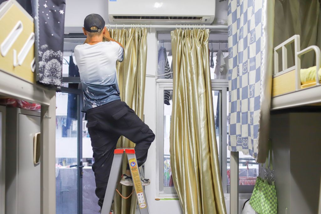 为提升宿舍生活的舒适性,教科院分批为新装修寝室及新生宿舍统一购置了窗帘。从商家选择到样品制作,学院坚持质量优良、价格公道、布料安全。9月28日和国庆节期间,11栋、12栋宿舍陆续进行了窗帘安装,国庆节后也将为新生宿舍统一购置与安装窗帘。