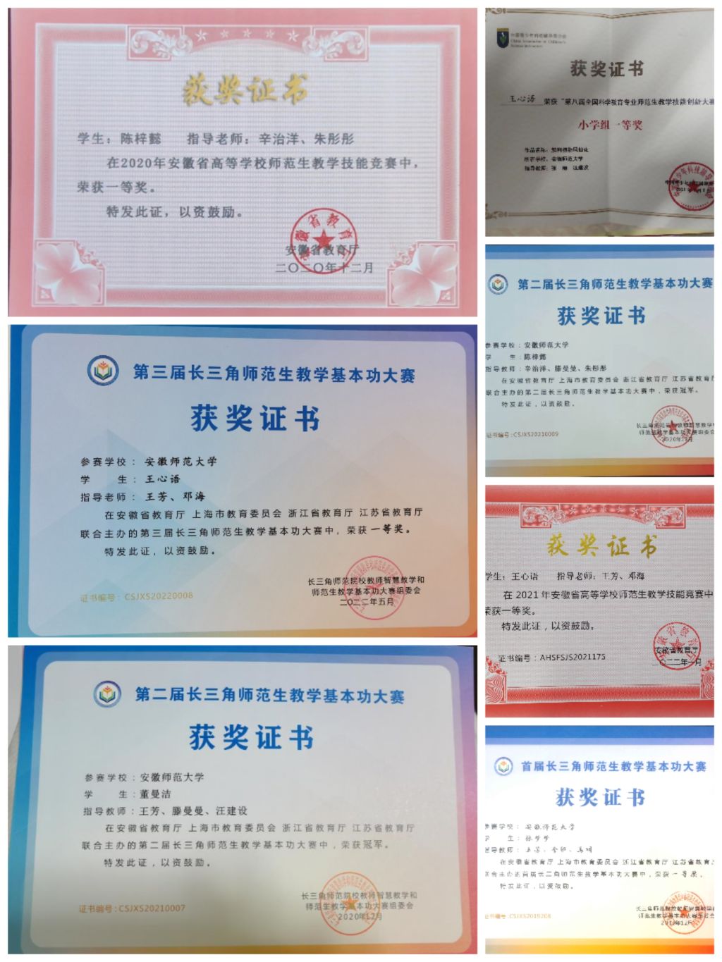 学生专业基础扎实,教学技能过硬,在历次大赛中成绩优异。自2019年开始,该专业组织学生参加安徽省高等学校师范生教学技能大赛、长三角师范生基本功大赛、全国科学教育专业师范生教学技能创新大赛、全国大学生英语竞赛、全国大学生数学竞赛等。近三年来,该专业学生在这些比赛中获奖达41人次,其中一等奖(冠军)9人次,二等奖(亚军)15人次,三等奖17人次。另外,在我校近日公布的48名田家炳优秀师范生奖学金获得者中,该专业2022届毕业生就有6名学生获奖,其中一等奖3名,占全校一等奖的一半,二等奖2名,三等奖1名。