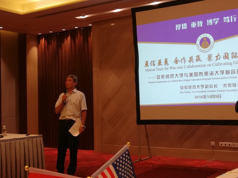 下午的会议论坛上,副校长朱家存教授结合国际合作与交流的政策分析,围绕《互信互惠 合作共赢 聚力国际化人才培养》主题作了40分钟讲演,朱家存在简要介绍安徽师大的办学历史、人才培养和90年办学成效的基础上,回顾了我校与美国布莱诺大学五年来合作办学的过程和取得主要成果,分享了双方成功合作的基本经验:一是坚持以生为本,将促进学生发展作为核心目标;二是坚持诚信合作,努力实现合作共赢;三是坚持问题为导向,双方充分沟通,及时有效解决;四是坚持公开透明,获得家长和学生普遍满意等。就双方下一步合作的愿景,朱家存指出,双方应继续坚持以生为本,全面提升人才培养质量,加大双方学生交流的力度,希望有更多的美方学生来中国学习更长的时间,加大教师交流的力度,促进教学与科学研究的深度合作,拓展深化合作领域,促进中美文化深入交流。