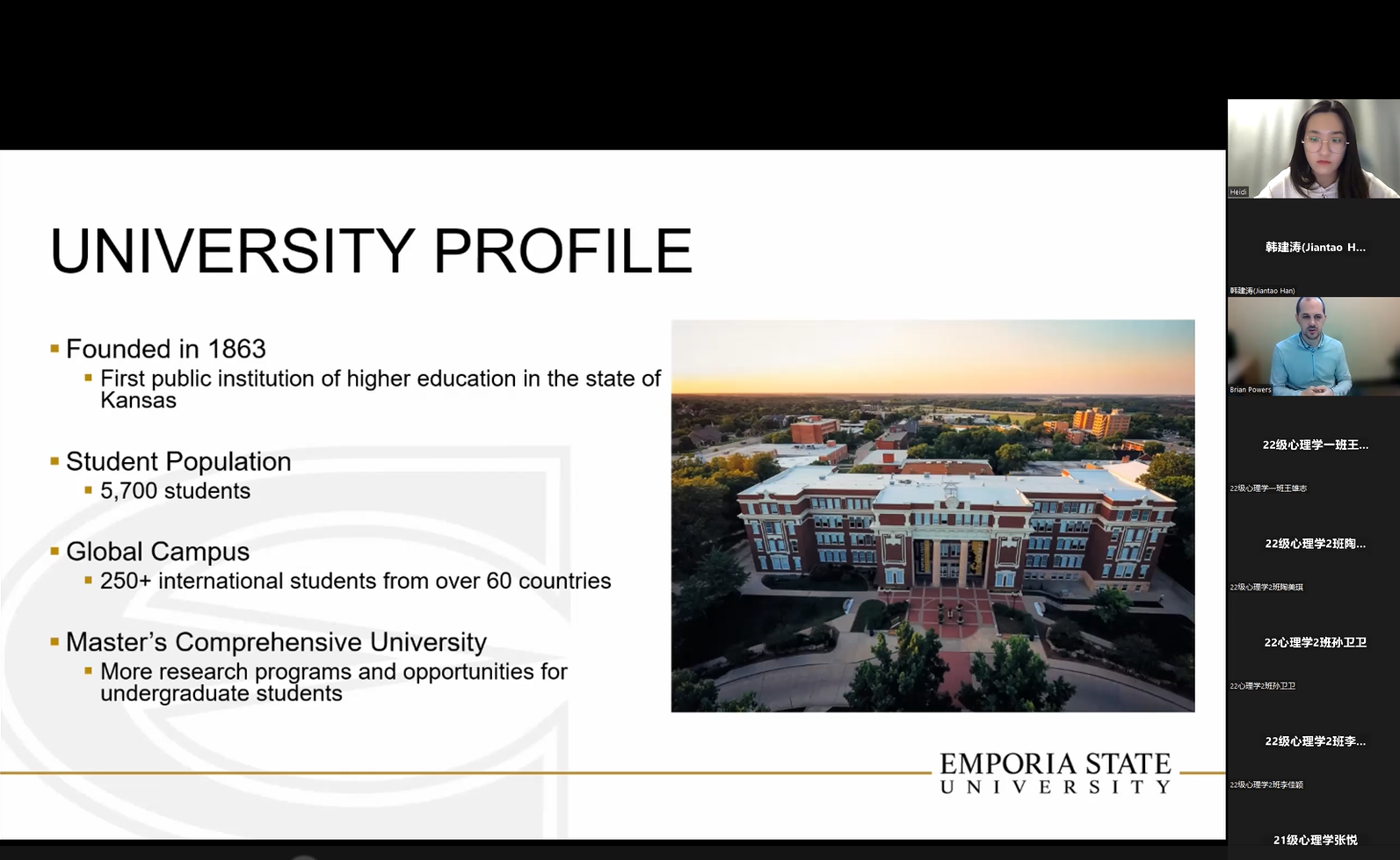 本网讯(文 图/靳晨曦)2023年4月11日晚,美国恩波利亚州立大学短期访学项目线上宣讲会顺利召开。恩波利亚州立大学国际教育学院国际招生处处长Brian Powers先生参会宣讲。会议由365英国上市官网副院长韩建涛主持,心理学和小学教育专业百名师生线上参会。
