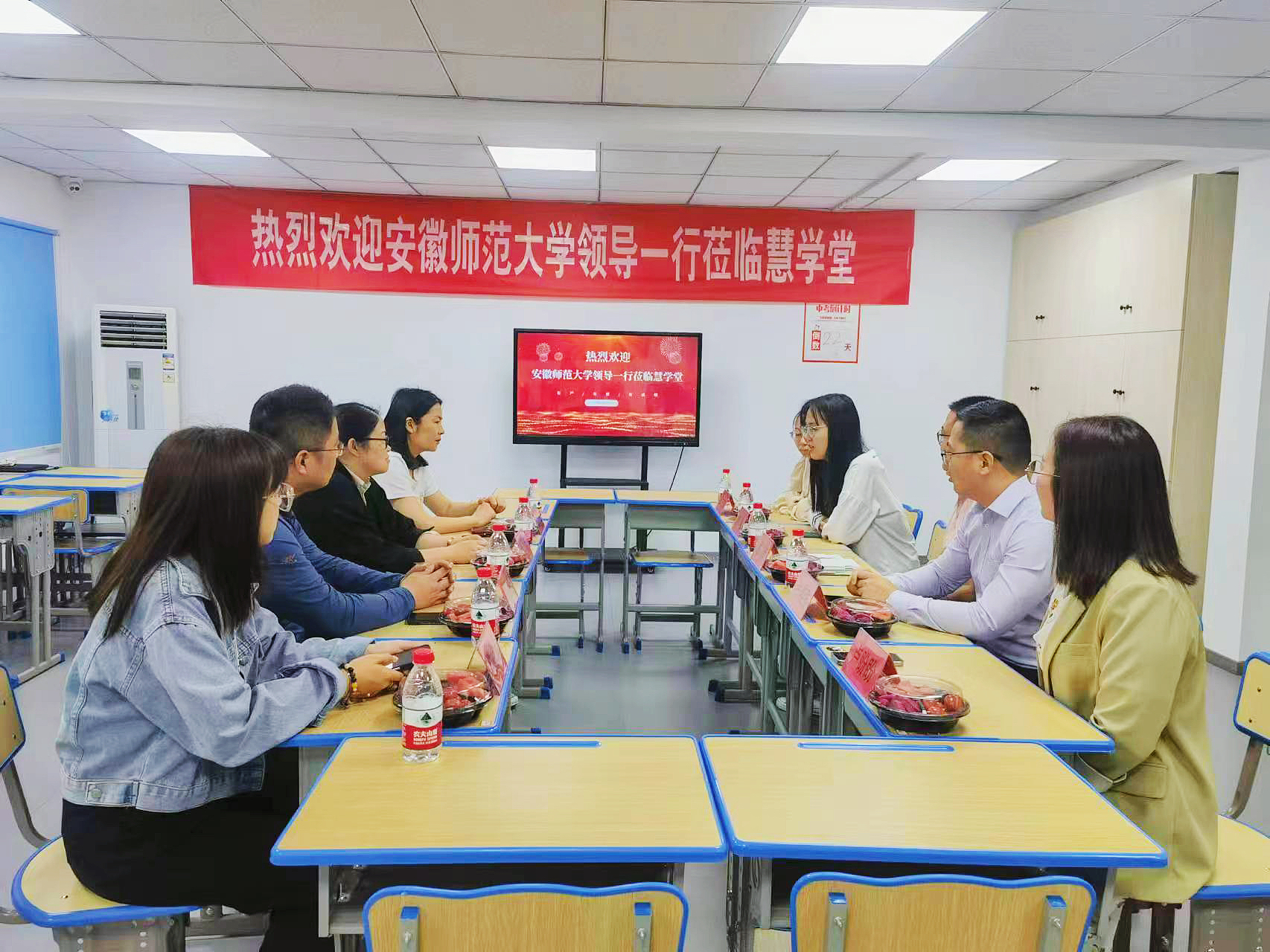 在镇江慧学堂教育培训中心,校长张涛强等人热情接待学院一行人。在深入了解慧学堂的办学理念、办学规模、办学模式等情况后,双方展开合作交流。在座谈会上,张涛强介绍了镇江的中高考政策、慧学堂的运营模式、招聘人才的需求,对教科院的人才培养质量给予高度认可,希望教科院能继续输送优秀毕业生,后续进行深度合作。在慧学堂实习的学院2023届毕业生储魏与王文文汇报了实习期间的收获。杜凤代表学院向慧学堂表示感谢,希望今后可以在毕业生就业、人才培养等方面深入合作。她鼓励正在实习的毕业生转变角色,做好职场规划,加强学习实践,积极适应岗位要求。