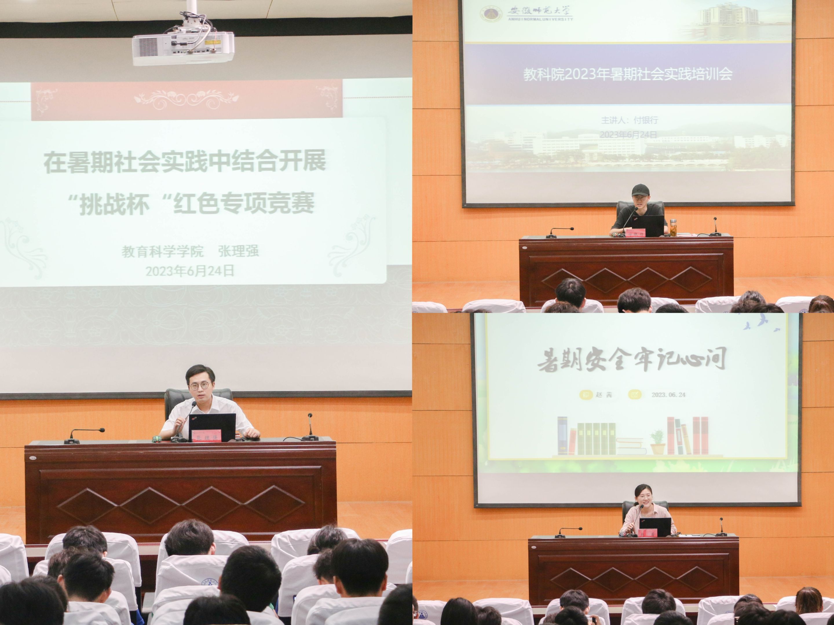 6月24日下午,365英国上市官网于赭山校区田楼报告厅举行2023年大学生暑期“三下乡”社会实践活动出征式。校团委副书记陈骁,学院党委书记许国飞,学院党委副书记杜凤,副院长韩建涛,学院阮成武教授,暑期社会实践思政指导教师龚伟、丁建文,团队指导教师代表,学院全体专兼职辅导员及社会实践团队学生代表参加仪式。仪式由学院团委书记张理强主持。