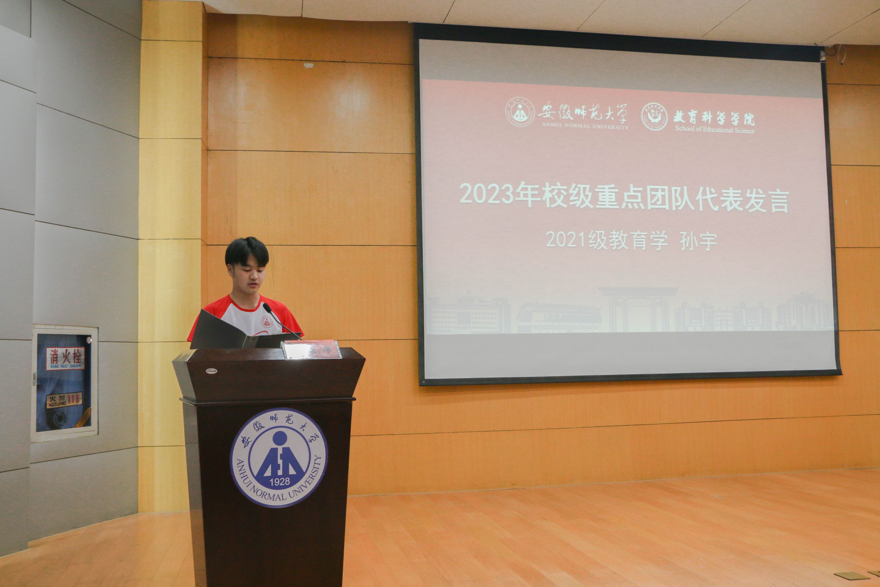 2020级学前教育专业本科生俞琦颖作为暑期社会实践优秀志愿者分享了她在和县的实践故事,并表示只有贴近实际、了解实际,才能发挥大学生人才优势,服务于社会建设。2021级教育学专业本科生孙宇作为校级重点团队代表做出承诺,将珍惜实践机会,以青春投身社会,用实践增长才干。