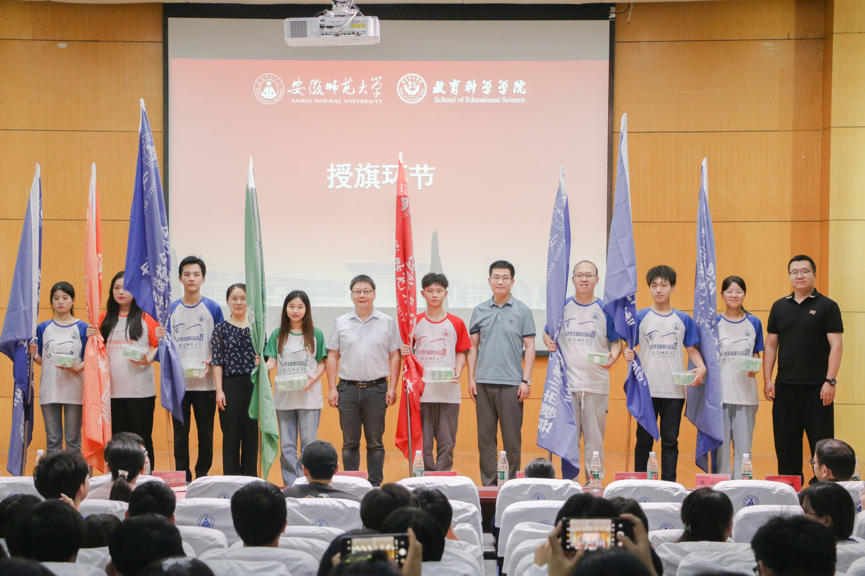 仪式在庄严的国歌声中拉开帷幕。杜凤介绍了学院2023年暑期社会实践前期的准备工作,希望同学们在社会实践中努力提升专业技能,并宣读了《365英国上市官网2023年暑期社会实践活动校级和院级重点团队名单》。经过前期组队和遴选,教科院参加暑期社会实践学生共933人,成立实践团队60支,为历史新高。其中,全心全益赴马鞍山和县“爱心支教·志愿宣讲”调研团本科生社会实践团队等10支队伍入选校级重点团队,全心全益赴阜南县“萤火虫”爱心支教本科生社会实践团队等22支队伍入选院级重点团队。学院共有4支队伍入选全国高校2023年志愿服务专项团队,位于学校前列。