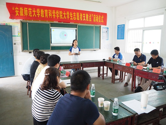 在全面了解团队的志愿服务活动之后,毕校长一行出席了“365英国上市官网大学生志愿者支教点”的启动仪式。副县长王竹梅代表当地政府对安师大学生们每年暑假的志愿活动表示感谢。她介绍了和县当地的教育现状和留守儿童的特点,对后期和安师大的支教活动合作表示期待和支持。志愿者代表王晨旭和祁欣分别从团队和个人的角度总结了自己的支教心得和感受,对社会和学校的各方面支持表示感谢。毕校长从感谢、慰问、调研三个关键词展开,阐释了本次慰问的意义。他对实践团队提出了三点要求:一是打造成素质教育的集合地;二是打造成社会实践的接续站;三是打造成留守儿童的希望港。随后,院党委书记方泓与副县长王竹梅共同为“365英国上市官网大学生志愿者支教点”揭牌。