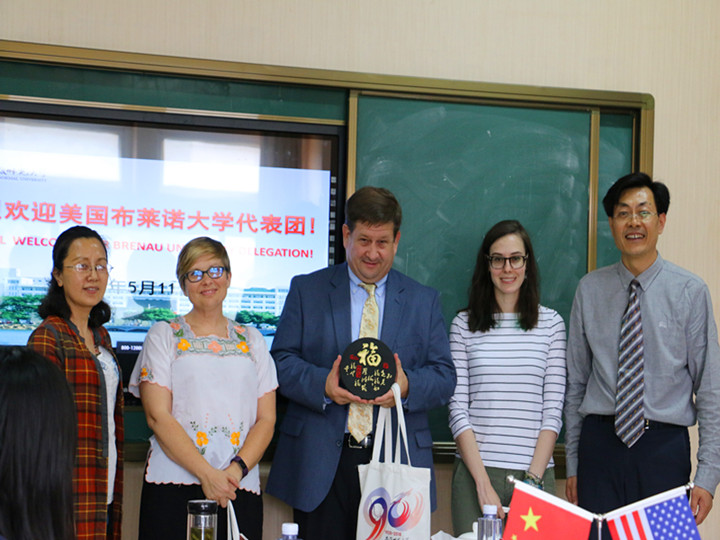 本网讯(教科院 管璇 张慕清)2018年5月11日,我院迎来了美国布莱诺大学教务长兼副校长James Eck,副校长Amanda Lammers,教育学院院长Williams Eugene,国际学生及项目负责人Jordan Anderson,以及学生代表团。本次会面在田家炳教育书院举行,旨在解决出国的相关事宜,加强中外合作办学,促进双方交流学习。我院院长桑青松,副书记张如华,院长助理周元宽,专业负责人赵学菊以及2016、17级学前教育(中美合作)专业全体同学参加了此次活动。会议由院长桑青松主持。