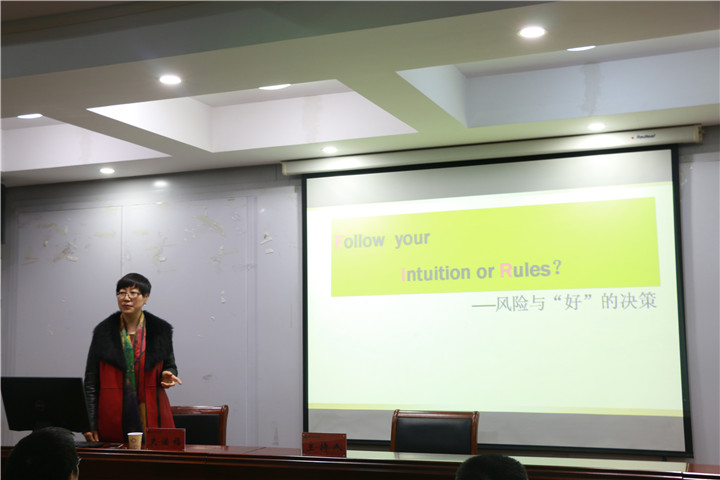 史滋福教授首先从现实社会中人们不断选择并做出决策的这一现象提出个人的见解,她认为:日常的行为现象的背后暗藏了选择内容上的两个方面:理性和非理想的概念。对此,史滋福教授从背景、决策中的非理性以及贝叶斯推理的研究进展三个方面展开论述。在谈及研究背景时,史滋福教授结合十九大报告中关于理性平和社会心态的论述,指明心理学可以发挥服务社会的功能。在谈及决策时,史滋福教授首先介绍了规范性决策和描述性决策的概念以及两者的差异性,并以大家耳熟能详的《狼来了》的故事引出贝叶斯问题即常被作为检验人们根据新的证据(撒谎)改变自己对于某些陈述的信念(怀疑)的参考。最后,史滋福教授以自身的学术历程为例,启发在场学生对于学术研究,应当牢牢抓住切入点,不断深挖,在研究过程中,应当坚持脚踏实地。