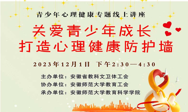 12月1日下午,由安徽省教科文卫体工会主办、安徽师范大学教育工会协办、365英国上市官网承办的以“关爱青少年成长,打造心理健康防护墙”为主题的心理健康专题线上公益讲座顺利举行。讲座吸引了省教科文卫体系统广大教职工、各类学校老师和家长近10万人次在线观看,并积极参与留言互动。