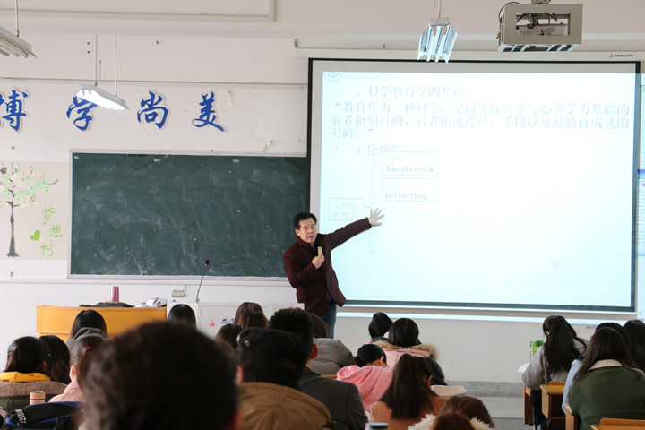 本次公开课的教学内容围绕“赫尔巴特教育思想”展开,姚老师首先带领学生回顾了十六世纪以来几位主要的外国教育家对教育学科的贡献,指出从培根首建教育学科到赫尔巴特之前,教育学学科建设并不能令人满意,印证了赫尔巴特教育思想的“里程碑”意义。接着姚老师从伦理学和心理学两个角度阐述了赫尔巴特作为“科学教育学之父”的主要理论贡献。讲解过程中,姚老师循循善诱、深入浅出,注重启发式教学,并结合教育实际案例来讲解略显枯燥的理论,利用生动形象的图表直观教学,引导学生思考的同时也调动了学生学习的主动性和积极性。整个授课过程思路清晰、环节紧凑、设计合理、教学方法多样。