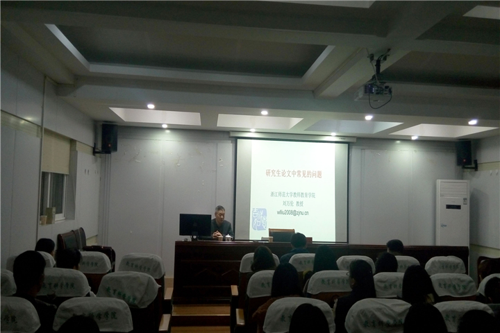 本网讯(教科院 文/叶舒婷 图/吴锋)为了提我院研究生论文写作能力,我院于11月24日在院三楼学术交流中心举办了“心理大讲坛”学术讲座。桑青松院长、桂守才教授、特邀浙江师范大学教师教育学院博士生导师刘万伦教授出席议会,桂守才教授主持会议,教科院全体研一研二心理学学生参加讲座。