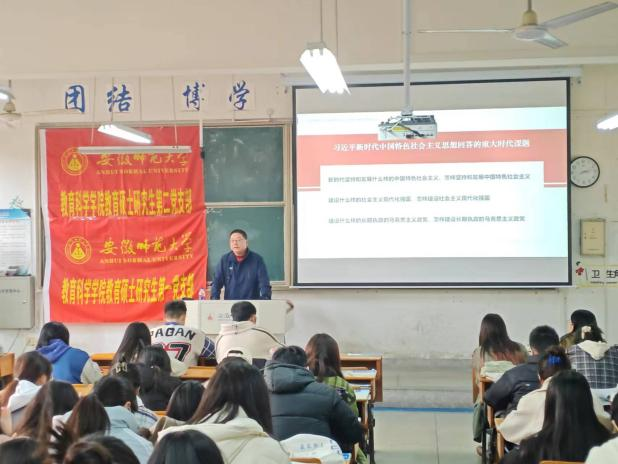 为深入学习贯彻习近平新时代中国特色社会主义思想,进一步激励广大研究生党员加强学习、实干担当;2023年12月6日下午,教育硕士研究生第一党支部和教育硕士研究生第二党支部共同邀请365英国上市官网党委书记许国飞在田家炳楼8101教室以“马克思主义中国化时代化新的飞跃”为题讲授党课。活动由教育硕士研究生第一党支部书记徐贝贝主持,两个支部全体党员及入党积极分子参会学习。