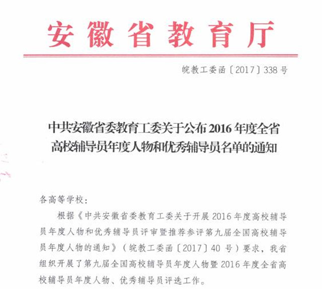 本网讯(教科院 张启山)日前,省委教育工委下发了《中共安徽省委教育工委关于公布2016年度全省高校辅导员年度人物和优秀辅导员的通知》,我院2014级专职辅导员龚伟老师被授予“2016年全省高校优秀辅导员”荣誉称号。