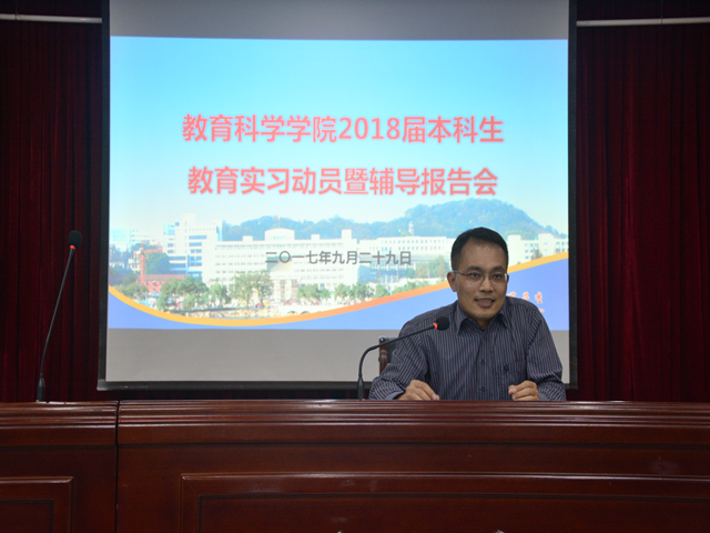 本网讯(教科院 尚娟 龚伟) 教学实习是学生对所学知识进行检验,并积累初步工作经验的重要学习环节。为保证2018届本科生实习工作的顺利展开, 9月29日下午3时,教科院在图书馆一楼报告厅召开了“教科院2018届本科生教育实习动员暨辅导报告会”,特邀请安庆六中胡建华校长做主题报告, 2014级辅导员龚伟、全体毕业班学生参与了此次会议。活动由院长助理,教育学专业副教授周元宽主持。