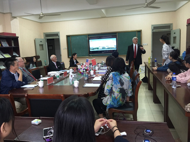 会上,布莱诺大学校长Edward Schrader 首先向大家介绍了布莱诺大学的基本情况以及中美学前专业的培养模式,他告诉同学们美方将在本学期专门派驻一名外教教师帮助大家准备赴美学习的相关资料,安慰大家不要太紧张。同时他也向大家展示了前面两届学生在美学习的情况,期望同学们能够采取多种方式提前了解布莱诺大学,做好相应的准备。