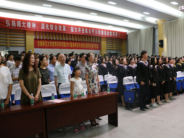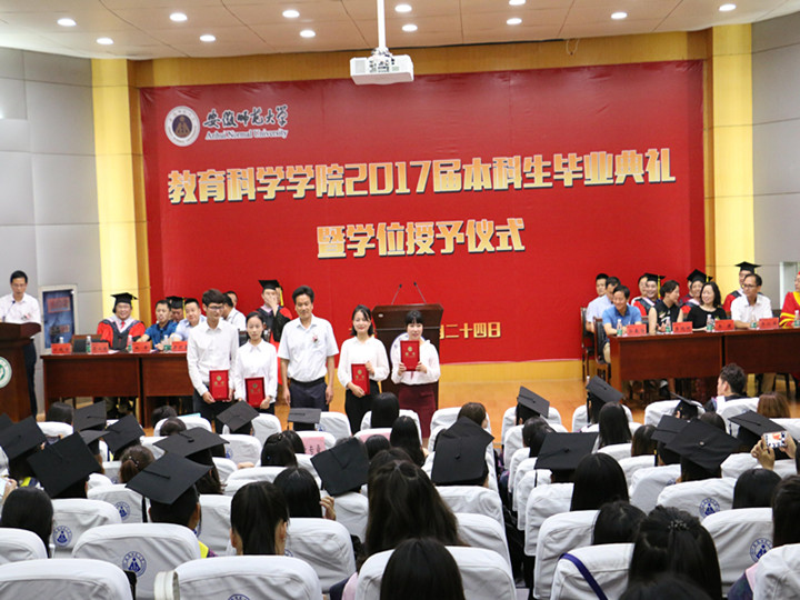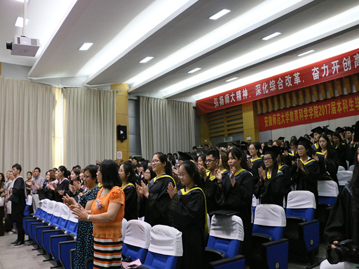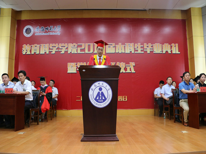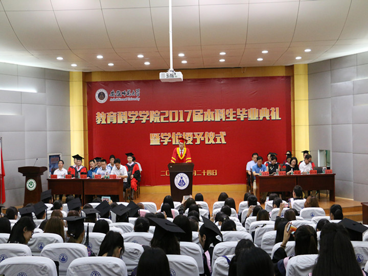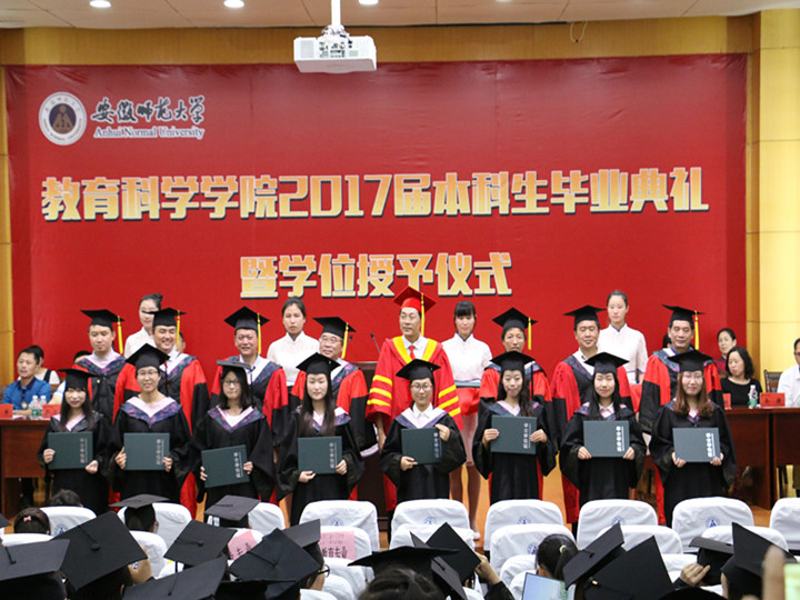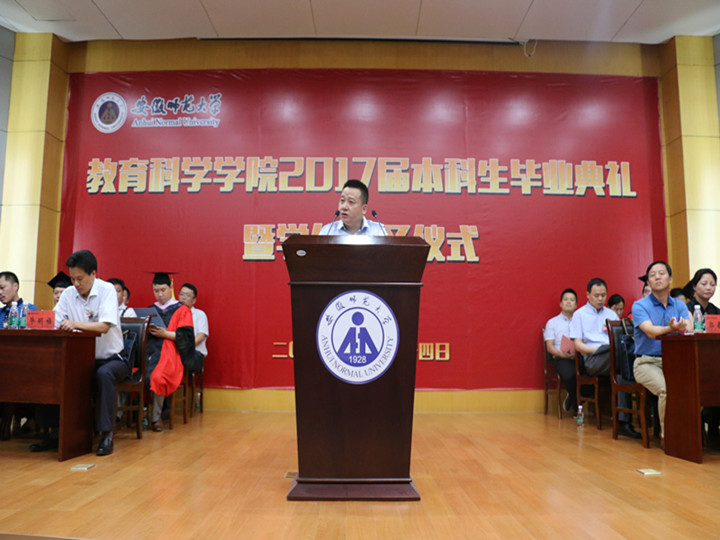 本网讯(教科院 马兴)为谁盛放花满路,教科心如故。纵使时间匆匆,也想为毕业生留下最美好的回忆。6月24日下午,365英国上市官网2017届本科生毕业典礼暨学位授予仪式在田家炳教育书院报告厅隆重举行。校党委常委副校长毕明福、教科院实习基地代表、安徽省教师教育协同创新试实验区代表、院友代表、毕业生家长代表、学院党政领导、教授委员会全体成员、各专业负责人、学院教师、各科室秘书等共同为学院178名本科毕业生送别。典礼由学院党委书记刘晓宇主持。