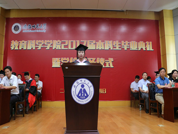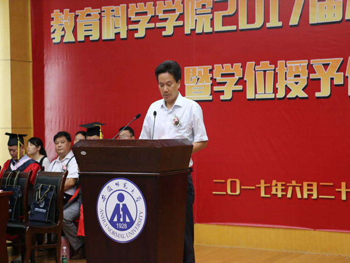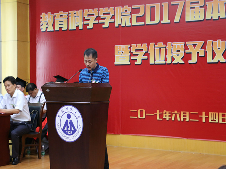 一场盛典,深深祝福只盼诸君前程似锦。“愿你们成为有温度、有高度、有力度的人,做到心中有大爱、眼里有乾坤、胸中有丘壑,脚踏实地,以只争朝夕的使命感、登高望远的责任感,永葆学习之心,勇担时代使命,尽显青春担当。”毕明福副校长的深深祝福与嘱托寄予了毕业生太多希望,他希望毕业生以大胆创新、勇攀高峰、主动引领的精神肩负起时代赋予的神圣使命,在激情奋斗中绽放青春光芒。院长桑青松满怀喜悦的祝贺学生顺利毕业,与同学们追忆了大学四年学院取得的成绩。他希望毕业生“告别过去超越自我”,将过去作为发展的基石,在更大的舞台上做最好的自己;他期待毕业生能够“立足当下成就自我”,在基层一线敢拼敢闯;他如父亲般叮嘱毕业生能够“拥抱未来善待自我”,要努力拼搏也要健康快乐。温情的话语让毕业生离情难舍,眷念无限。校友芜湖市广播电视台副台长韩万春希望毕业生能够永葆大气、正气、灵气、霸气,开创更美好的未来,为母校争光,为学院添彩。毕业生家长代表柏军在对学校学院表示感谢的同时也期待毕业生能够继续将教科院当成自己的家,继续好好努力,报效学院的精心培养。毕业生侯晓丽代表全体178名毕业生表达了对母校深深感恩留念之情无限祝福感恩,将是我们一生奋斗的动力。