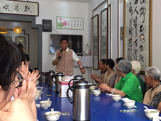 雨花斋成立于2011年诞生于杭州建德,至今全国已开设800余家分店。作为全素的免费食店,整个餐厅钱、粮、物的供给均采用互助模式,由社会各界爱心人士自愿捐赠,对于每位前来用餐者都抱着欢迎的态度,无条件为其免费供应素食。在这里,没有浪费,只有珍惜。“雨花斋”的理念就是教人学会感恩,旨在“传递爱心、拒绝杀戮、保护环境、健康素食”。除了免费提供素食,餐厅还先后开展了“感恩母亲节”、传颂“身边的好人事迹”等一系列弘扬社会主旋律的活动。正是带着对于中国“孝”文化的尊崇,带着学习中华优秀传统文化的目标,我们来到了这里。