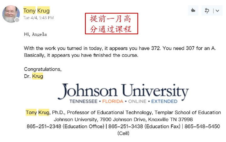 四位同学在一年的国外学习中,共学习了十二门课程,内容包括多媒体技术应用、全球化教育、网站建设、3D打印技术,创客工厂以及Web2.0等,扎实的学风,刻苦钻研的精神是每位同学顺利通过课程圆满完成学业的保证。其中,朱永媛同学不仅担任中国旗手参加约翰逊大学的文化交流活动,更是以372高分超过A标准65分提前近一个月完成所有课程学习,创造了教育技术学中美合作硕士项目海外留学生提前完成学业的记录;孙力力同学入选了约翰逊大学校网球队队员,代表学校参加了多场网球赛事,他们以优异的表现获得了约翰逊大学校方的一致肯定,既展现了安徽师范大学学子良好的学习能力和风貌,又为海外的中国留学生赢得了良好的声誉。