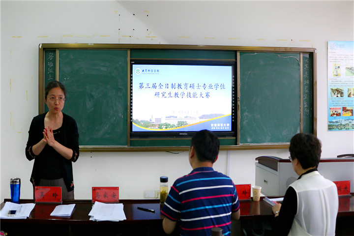 本网讯(文/胡旭珽 图/魏文静)为更好适应教育硕士专业学位研究生教学改革新形势,夯实教学基本功,提升教学素养,我院于5月12日上午,在412教室举行全日制教育硕士研究生教学技能大赛决赛。应邀出席本次大赛的评委嘉宾有:芜湖师范附小校长赵玲老师,芜湖职业技术学院许普东副教授,我院吴玲教授、马家安副教授、袁同庆老师等。大赛由副院长李宜江教授主持,16级专业学位全体研究生到场观赛。