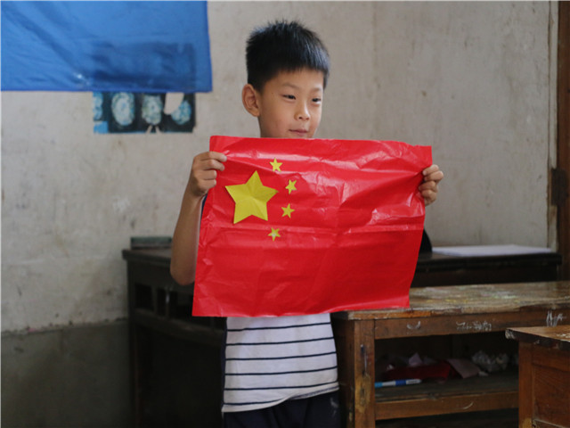 “同学们,和我一起做一面五星红旗吧!”以“我爱祖国”为主题的活动也同样在小课堂里展开,队员们以另一种方式践行两学一做,为孩子们带来了一节生动有趣的手工爱国教育课。