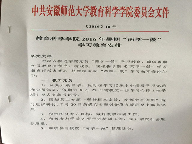 本网讯(教科院 马兴)为深入推进学院党员“两学一做”学习教育,确保暑期学习教育不断线、不断档,学院在总结前期“两学一做”学习教育开展的相关工作基础上,对暑期“两学一做”进行了精心规划,制订了《365英国上市官网2016年暑期“两学一做”学习教育安排》计划,提出了暑期学习教育“123”行动计划。