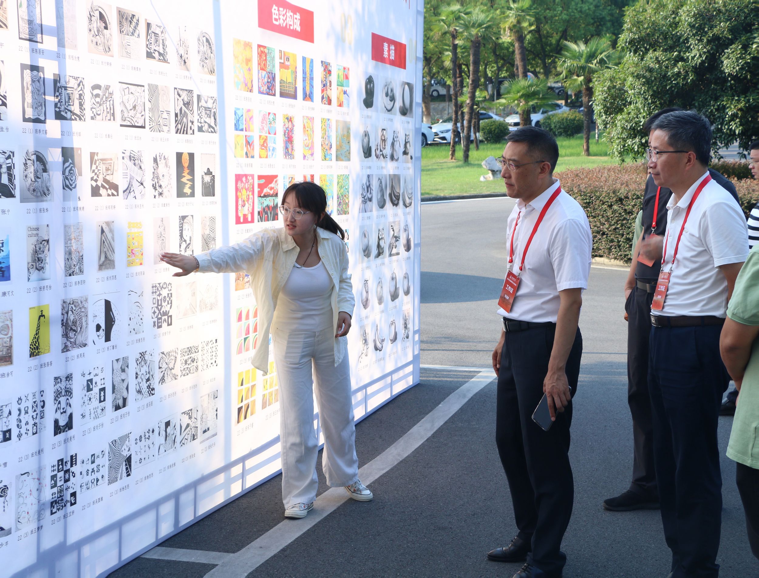 9月7日下午,安徽师范大学党委书记张立驰、副校长曾黎明、党委副书记胡靖,网络安全与信息化办公室主任吴长义等领导前来指导和参观展览,2班班长靳雨晴作为引导员,向领导们介绍小教专业同学美术教学成果的基本情况,同学们大多是零基础开始学习美术,从素描阶段用线条勾勒画作,过渡到利用透视明暗对比绘制立体图形,再到不同颜色搭配的色彩构成、直观的平面构成以及创造性的立体构成。靳雨晴还对部分作品进行了讲解,充分展示小教学子的风采,获得领导的一致好评。