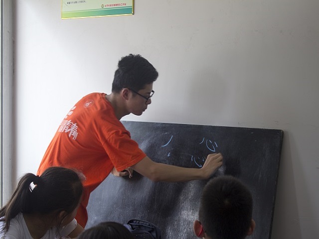十点半左右,书法课程正式开始。今天的书法课程由队员宋国健开展,学生响应强烈。“横要稍斜,竖要畅;长横有弧,短横粗……”,根据队员宋国健的指导,孩子们在自己的练习纸上一笔一划的写着。虽然一天的学习不能让孩子的汉字书写水平得到很大的提升,但是他们认真的样子让队员们有理由相信:未来,他们都会书写一个个灿烂的人生。