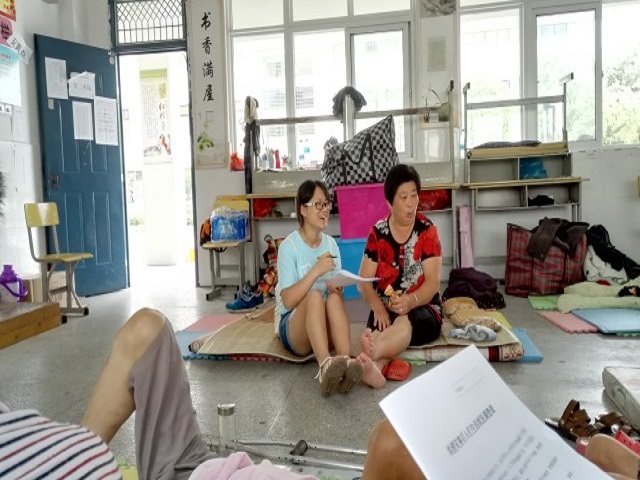7月10日下午两点,安师大学生志愿者们继续前往另一个灾民安置点——镜湖新城实验学校。这是长江南岸芜湖市镜湖区的一所中小学合并校。学校给学生们提前一个星期放了暑假;接着,学校的18个教室里,就住进了近500名“客人”。他们是来自距城区30公里的方村镇和荆山镇的村民。一周多来,持续的暴雨使得江水猛涨,这两个位于青弋江畔的小镇四周的圩坝超过了警戒水位。面对被洪水吞没的危险,7月4日凌晨,当地政府组织村民们转移了出来。村民的财产、房屋等方面均受到了不同程度的损害,同时灾后的心理救援也刻不容缓。安师大志愿者们协助心理系教授全莉娟老师就村民灾后心理展开了一个问卷调查。一支笔,一沓问卷,志愿者们以高度的热情投身到问卷调查中去,耐心的给村民解答对问卷的疑惑,并在调查期间对灾民进行慰问,同村民进行了亲切友好的交流,面对自然灾害,村民们物质上和精神上都受到了不同程度的伤害,“转移到这边以后,我闭上眼睛时常还会想到当时的场景,偶尔还会从睡梦中惊醒”,村民杨宇如是说。同村民的亲切攀谈中,拉近了志愿者和村民的距离,村民也渐渐敞开了心扉,沉闷的环境中多了一些欢笑,在一阵阵欢声笑语中问卷调查也接近了尾声。