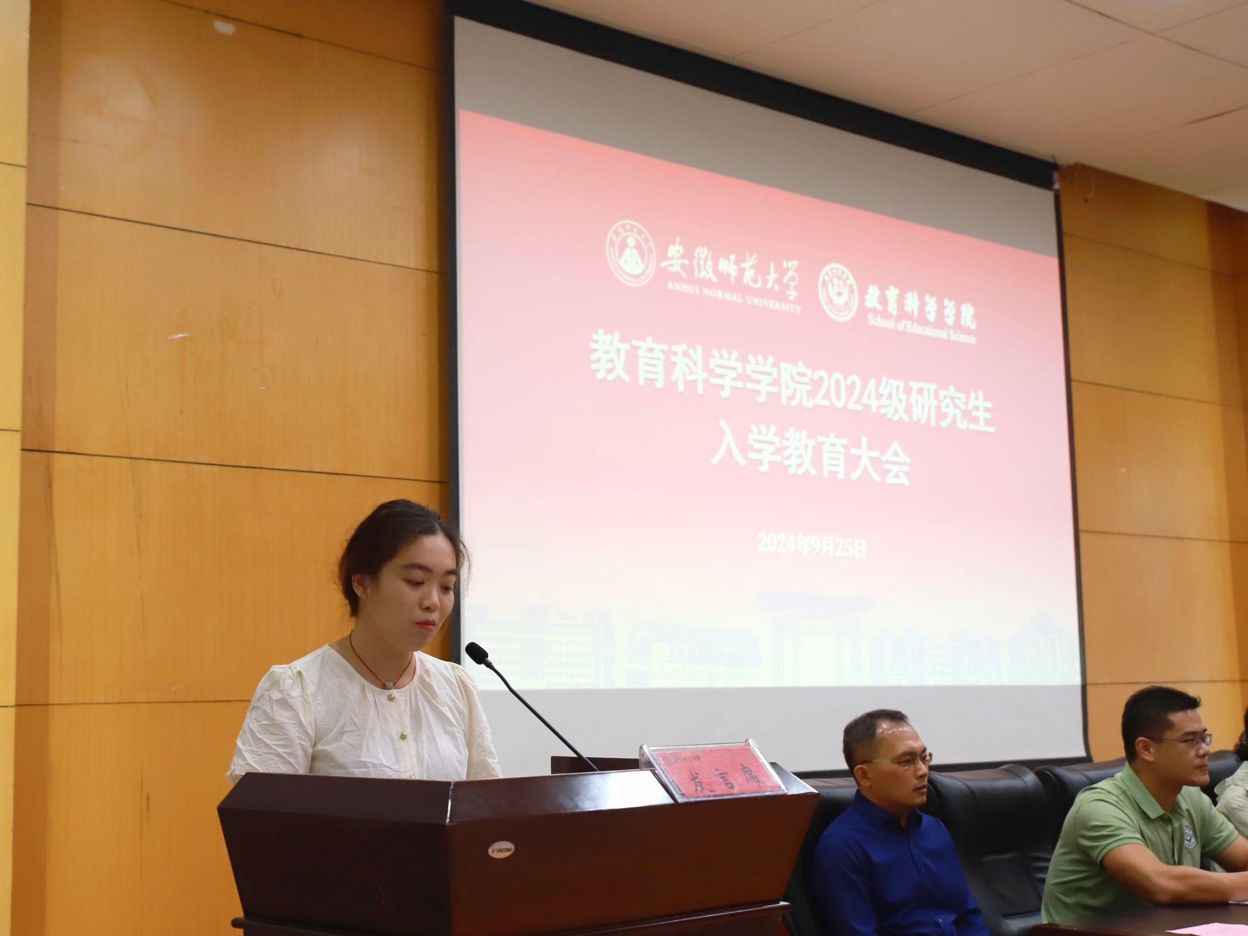 会初,全体师生齐唱国歌。2024级学前教育学专业薛敏作为新生代表发言。薛敏从自身的支教经历出发,将站在讲台上的实践经验与坐在教室里的汲取知识相结合,充分展示了教育的强大力量。2022级小学教育学专业俞晓雨作为老生代表发言。俞晓雨认为,研究生应扎根专业的沃土,通过不间断地学习、实践,培养自身“精益求精”的恒心、“不惧风雨”的耐心以及“向上生长”的信心,以全新的姿态面对即将到来的研究生生活。2021级心理学专业赵欣桐作为毕业生代表发言。赵欣桐总结硕士阶段的经验,提醒新生应珍惜时光、积极规划、勇于探索、不断学习,以实现个人梦想和目标。