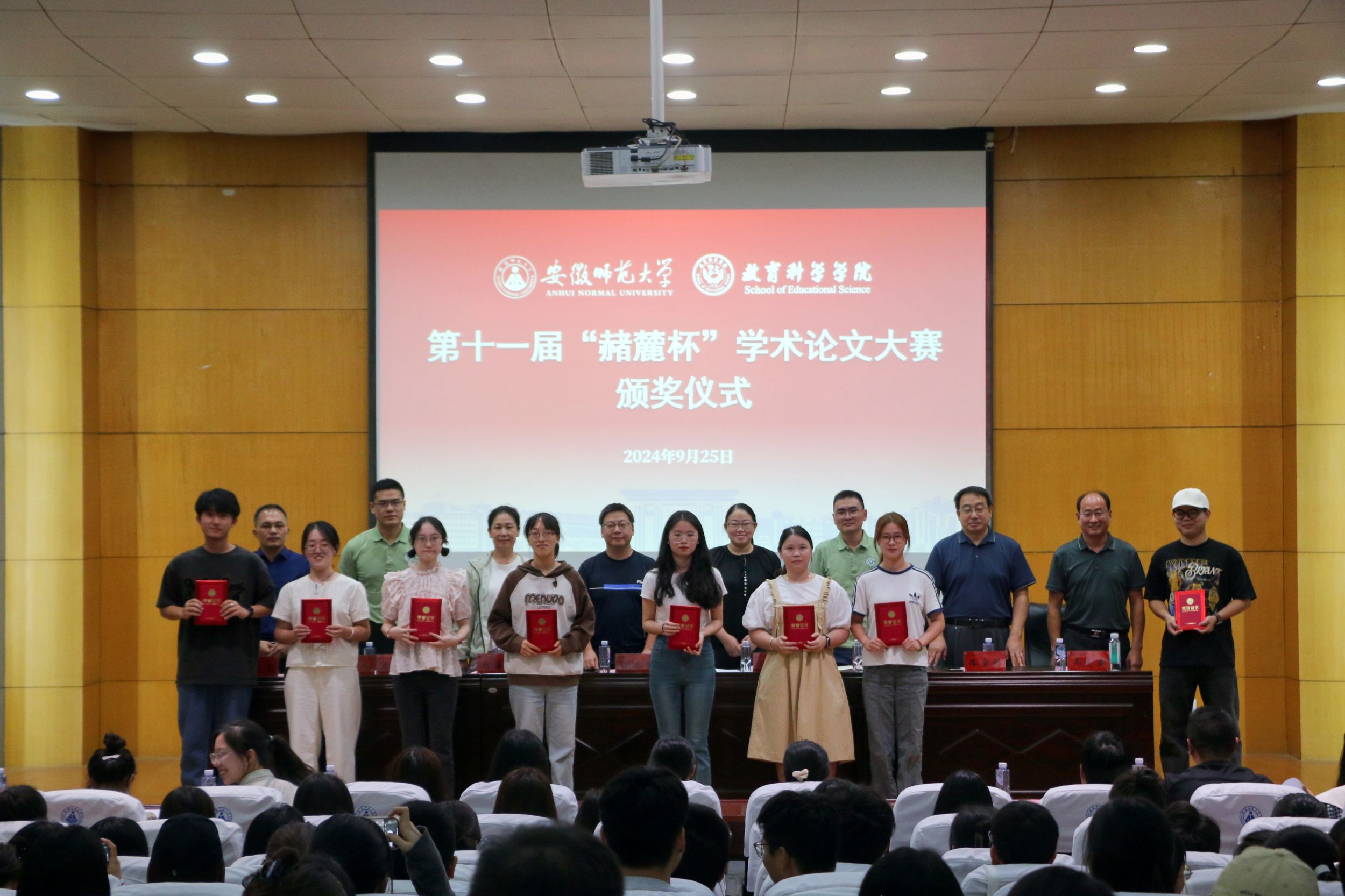 本届“赭麓杯”获奖同学代表上台领奖。院领导班子成员及各学位点负责人作为颁奖嘉宾颁奖。“赭麓杯”旨在促进学院同学积极参与学术实践活动,积极提升自身学术能力以及科研协作能力,是教科院积极推动学校“三大行动计划”的一项重要举措。