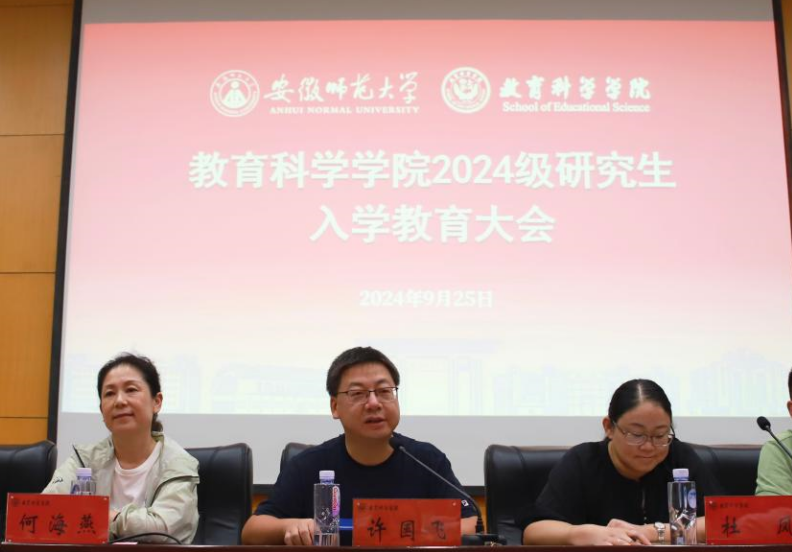 许国飞代表学院致辞。许国飞从“专业、学科、课程、师资、平台以及优秀校友”等六个方面全面论述了教科院悠久的办学历史以及雄厚的教学实力。此外,许国飞从端正政治思想、不断勤奋学习、丰富实践经历、坚定学术底线以及不断自我革命等五个方面向全体新生提出了殷切期望,勉励大家未来三年在学院可以获得成长,谱写美好青春。