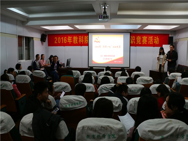 本网讯(教科院 胡冉冉)为进一步增强我院学生党员的理论素养,提升学生做一名合格共产党员的能力,教科院分党校于4月27日晚举办“两学一做”知识竞赛活动。教科院第三期党员教育培训班全体学员、研究生党支部以及2013级本科生党支部成员参加了本次活动。