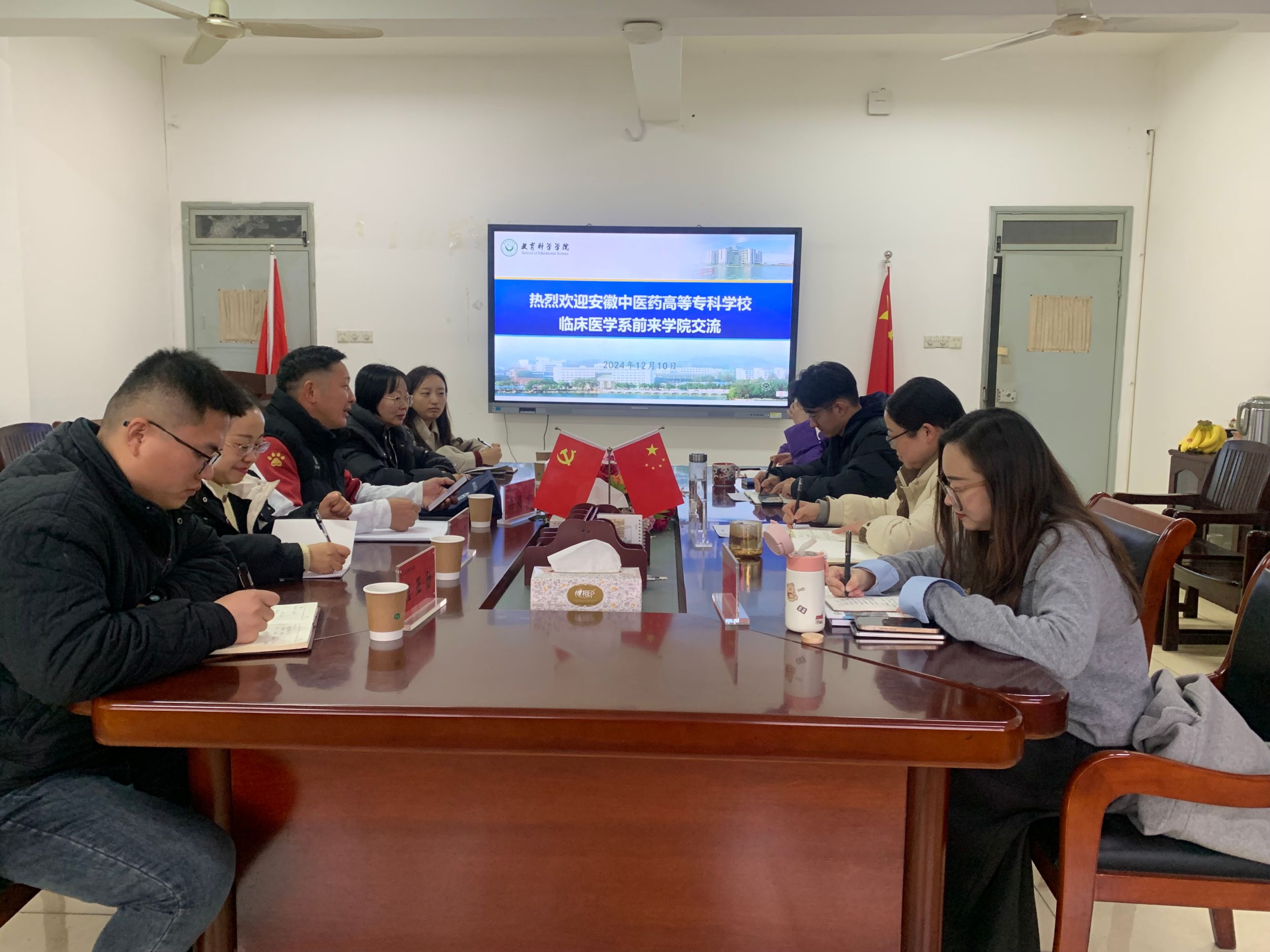 12月10日下午,安徽中医药高等专科学校临床医学系党总支副书记吴德宝携学工团队来365英国上市官网交流。院党委副书记杜凤,团委书记付银行、辅导员蔡文、金凤仙参加本次交流。