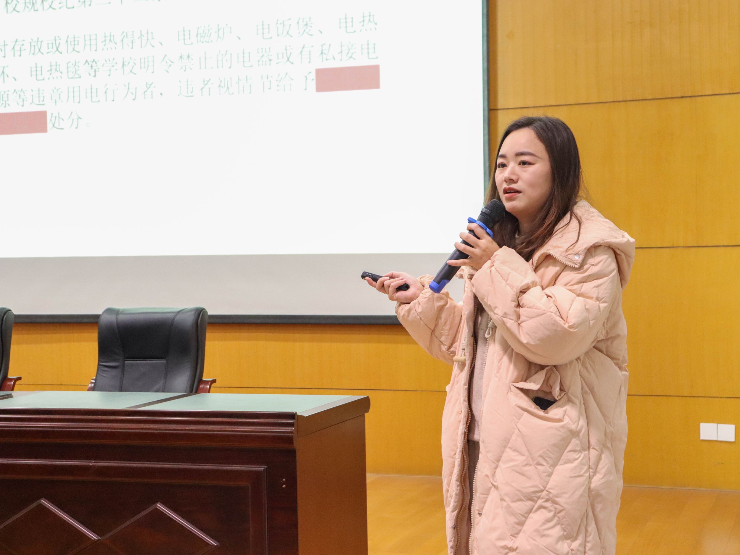 蔡文从校规校纪出发,提醒同学们严禁使用发热电器,要树牢安全底线思维,养成文明行为习惯,保障自身安全。随后通过典型案例为同学们讲述了安全隐患带来的危害,希望同学们以此为戒,提高安全意识,防患于未然。