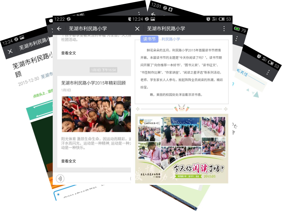平台开通后,受到广大师生及家长的共同关注,截至目前为止,平台已经推送了芜湖市利民路小学“2015精彩回顾主题、利民路小学2015首届读书节、利民路小学2015毕业典礼、利民路小学——‘悦纳课堂’、利民路小学——缤纷社团”等多个校园资讯,关注人数已到1594人。在信息技术协同创新实验区的大力支持下,后期,实验学校将通过该平台推送学科教学优质微课资源,进一步探索信息技术与学科教学的深度融合,充分利用好微信平台,推送丰富的资讯和共享优质教育资源,构筑校园品牌推广、互动交流、信息服务的全新阵地,逐步实现校园文化建设从实体化向网络化覆盖的转变。