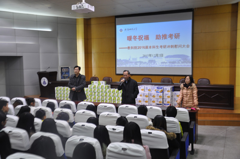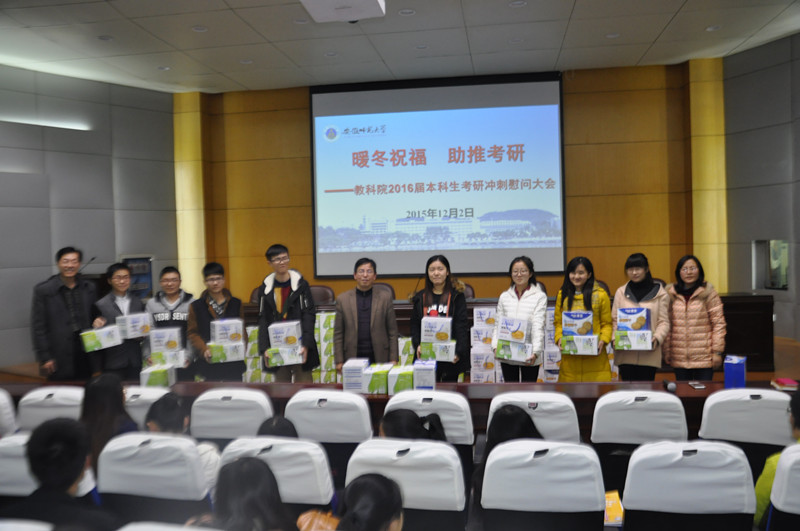 本网讯(教科院 张玉楠)不忘初心,方得始终。2015年考研即将进入攻坚阶段,为了给考研同学提供更好的服务,鼓足士气,12月2日下午,学院在田楼报告厅开展2016届本科生考研冲刺慰问。学院党政领导刘晓宇、张如华、桑青松、阮成武在2012级辅导员孟庆娟的陪同下专程慰问考研学子,并与同学们进行了亲切交谈。