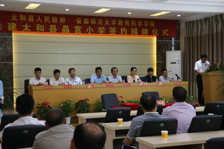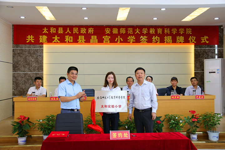 本网讯(教科院 孟庆娟)9月14日上午,学院与太和县人民政府共建太和县晶宫小学签约揭牌仪式在晶宫小学举行。院长葛明贵教授,副院长阮成武教授,太和县县委常委、宣传部长孙秀剑,副县长闪旭,教育局长陈玉健等出席了签约仪式。