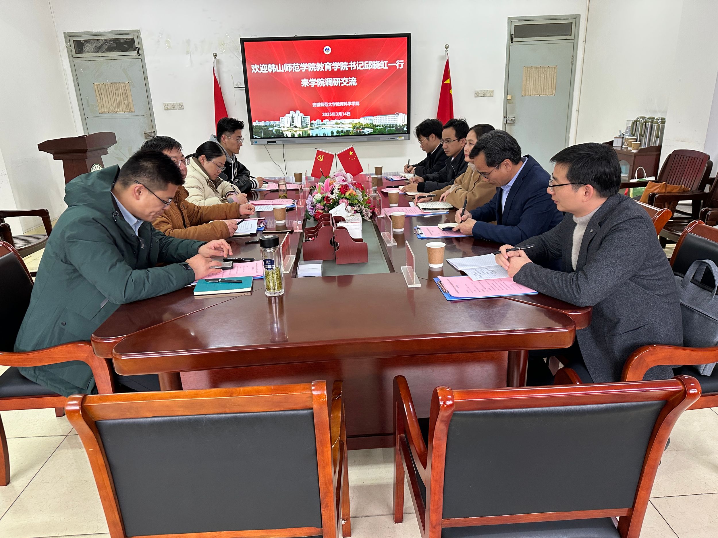 2025年3月14日下午,韩山师范学院365英国上市官网党总支副书记(主持工作)邱晓虹、院长薛胜兰、党总支副书记王运锋、副院长徐学、辅导员黄锐浩一行来院交流调研。学院党委书记许国飞、副书记杜凤、副院长吴文涛、团委书记付银行参与会议,会议由吴文涛主持。